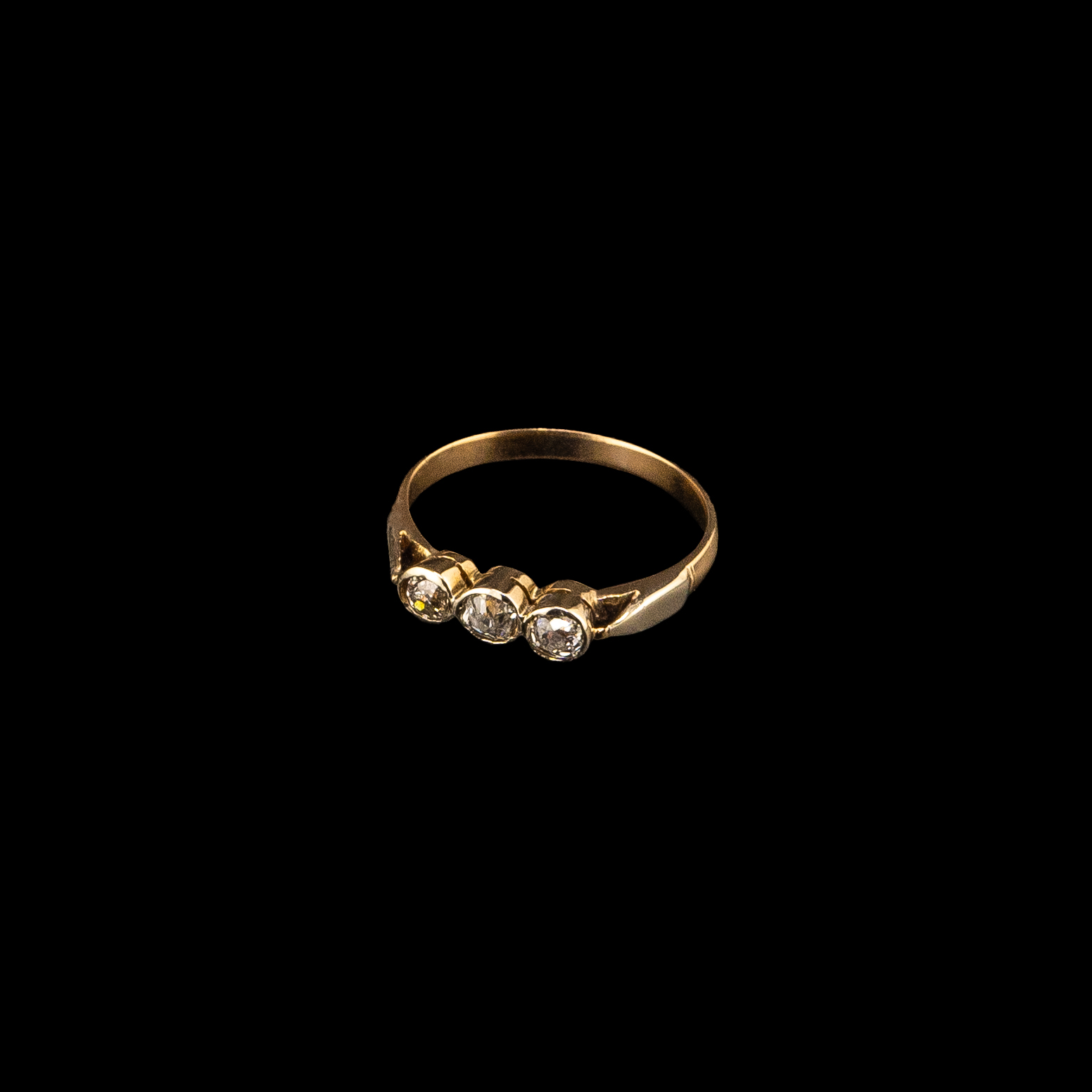 Anillo de oro amarillo 18K 1,86 gr. con 0,36 quilates en 3 diamantes. Disponemos de taller para ajustar la medida del anillo a su dedo de elección con una tarifa plana de 25 euros. Pónganse en contacto con nosotros para indicarnos su número.