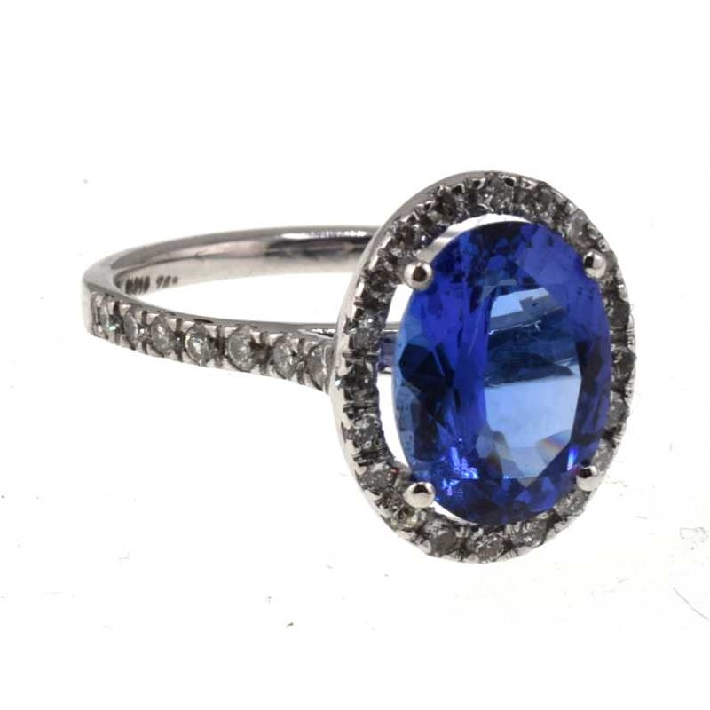 Anillo de oro blanco 18K 4,14gr con tanzanita talla oval de 3,49 quilates y 0,31 quilates en 34 diamantes.