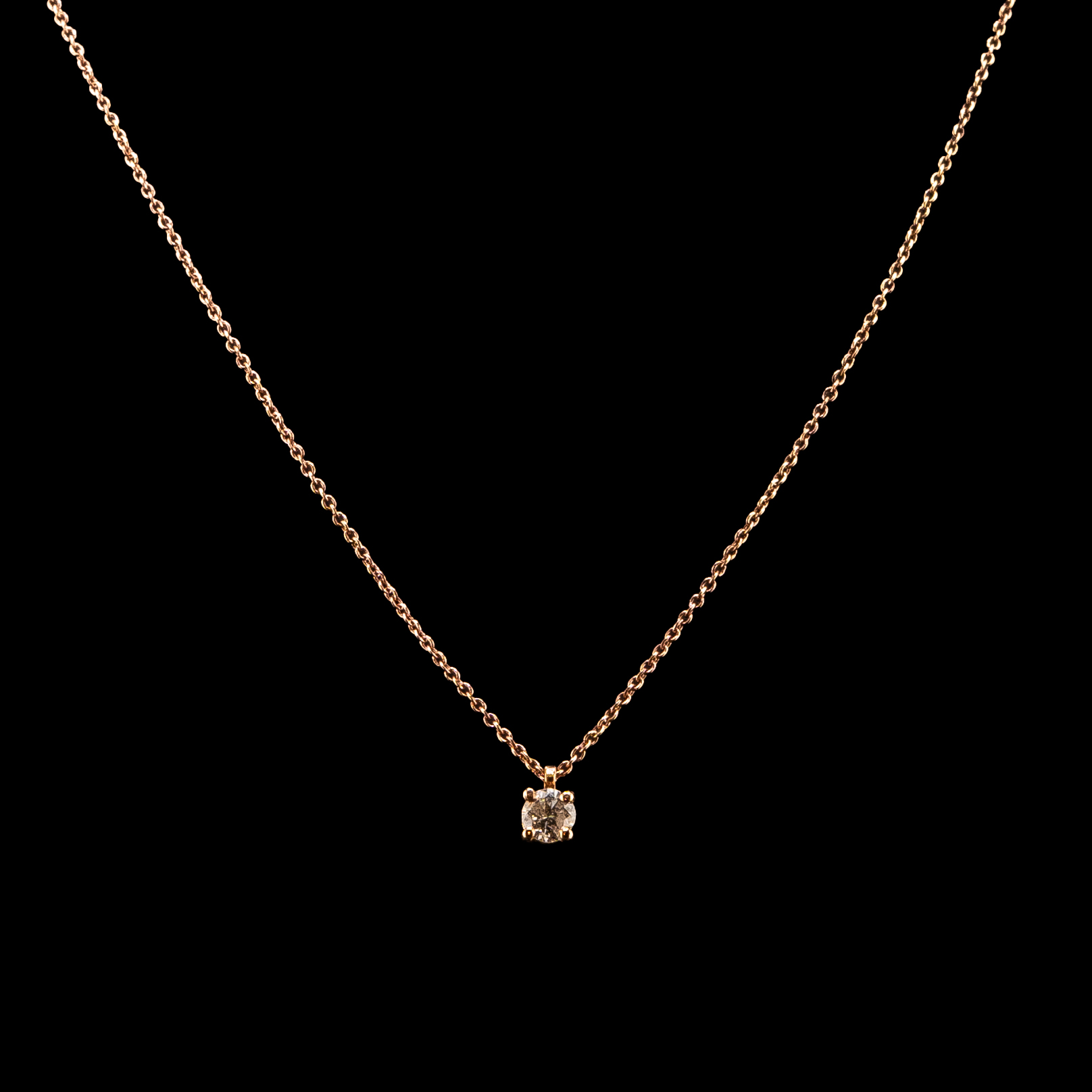 Colgante con cadena 42 y 45 cm en oro rosa 18K 0,96 gr. con diamante de 0,10 quilates. Disponemos de cadenas a juego de diferentes largos y grosores. Pónganse en contacto con nosotros si desea mas información y precios